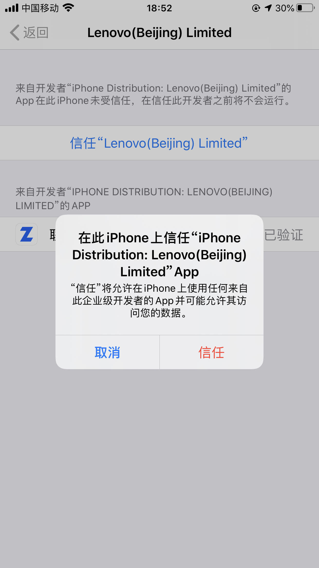 点击设置-通用-设备管理:选择信任Lenovo(Beijing)Limited>